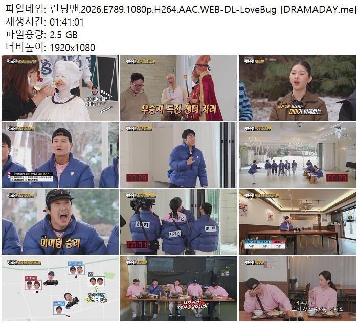 | 런닝맨.2026.E789.1080p.H264.AAC.WEB-DL-LoveBug [DRAMADAY.me].mkv | 2.5 G | 01:41:00 | 1920x1080 |