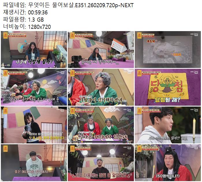 | 무엇이든 물어보살.E351.260209.720p-NEXT.mp4 | 1.3 G | 00:59:36 | 1280x720 |