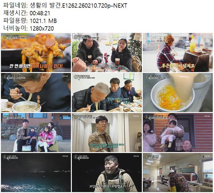 | 생활의 발견.E1262.260210.720p-NEXT.mp4 | 1021.1 M | 00:48:21 | 1280x720 |