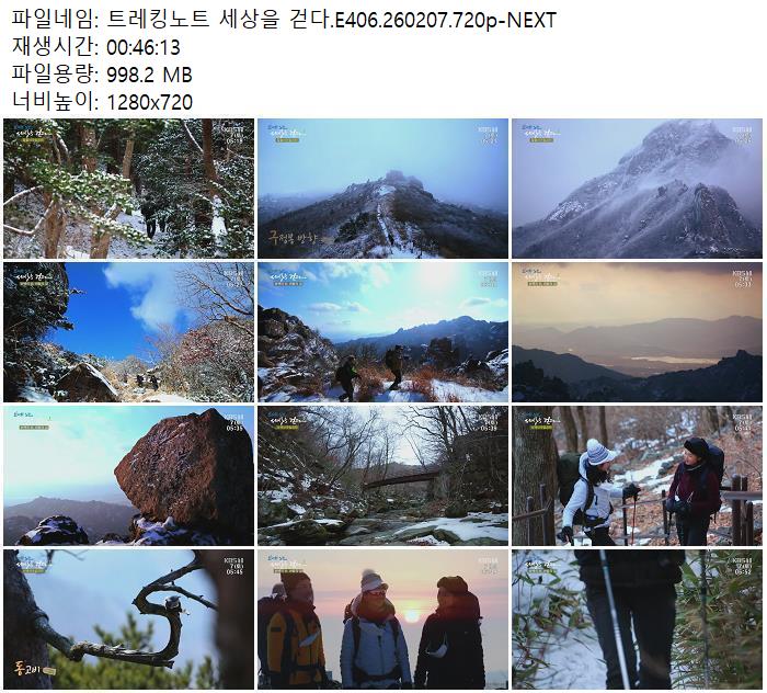| 트레킹노트 세상을 걷다.E406.260207.720p-NEXT.mp4 | 998.2 M | 00:46:13 | 1280x720 |