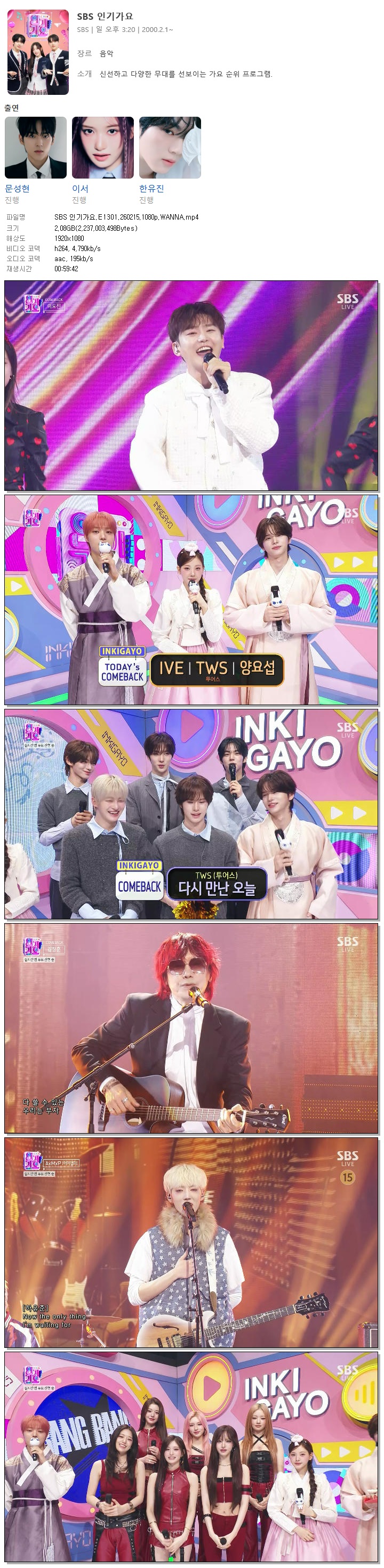 | [SBS] SBS 인기가요.E1301.260215.1080p.WANNA[아이브, 투어스].mp4 | 2.1 G | 00:59:42 | 1920x1080 |