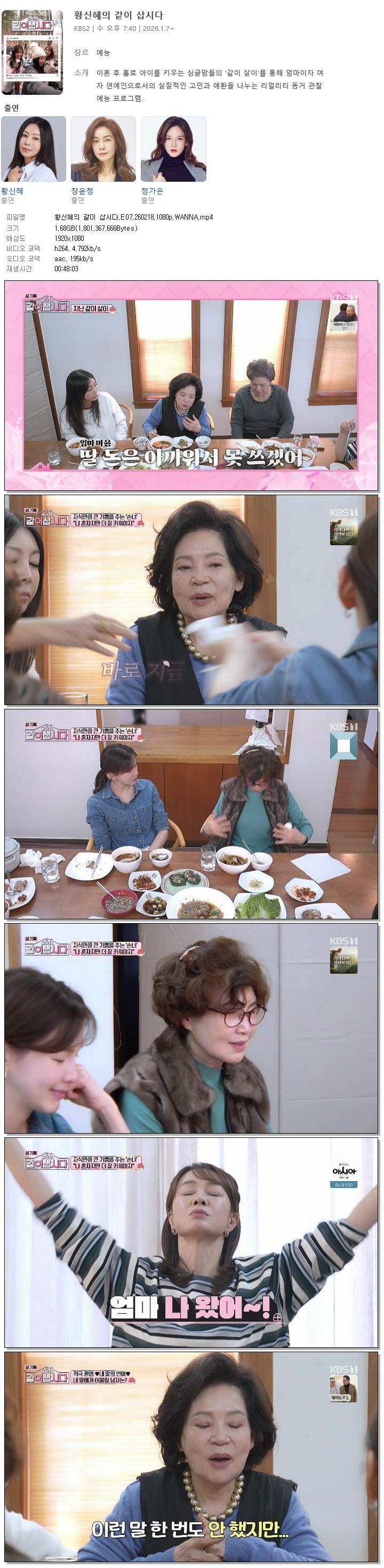 | [KBS1] 황신혜의 같이 삽시다.E07.260218.1080p.WANNA[황신혜, 정가은].mp4 | 1.7 G | 00:48:03 | 1920x1080 |