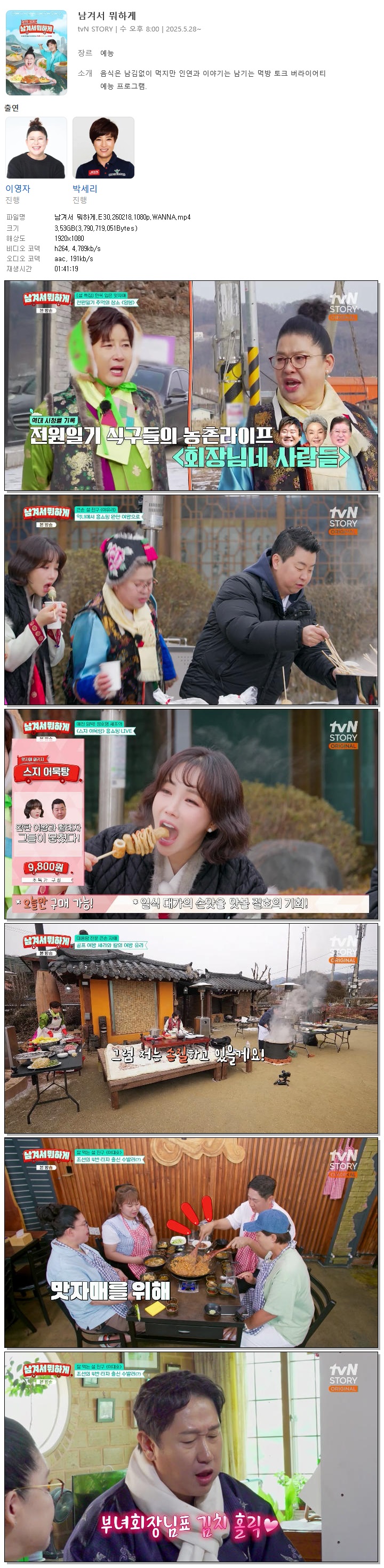 | [TVN STORY] 남겨서 뭐하게.E30.260218.1080p.WANNA[이대호, 이유리].mp4 | 3.5 G | 01:41:19 | 1920x1080 |