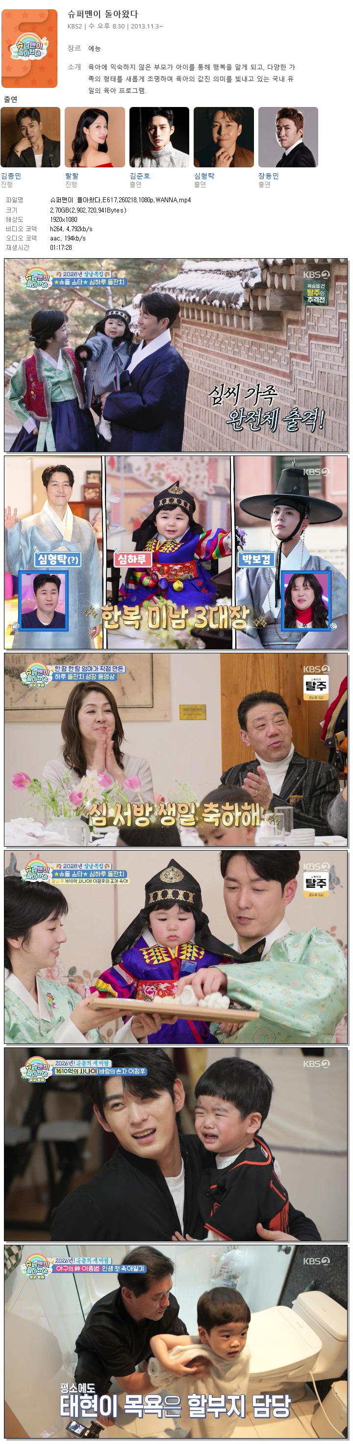 | [KBS2] 슈퍼맨이 돌아왔다.E617.260218.1080p.WANNA[김종민, 랄랄].mp4 | 2.7 G | 01:17:28 | 1920x1080 |