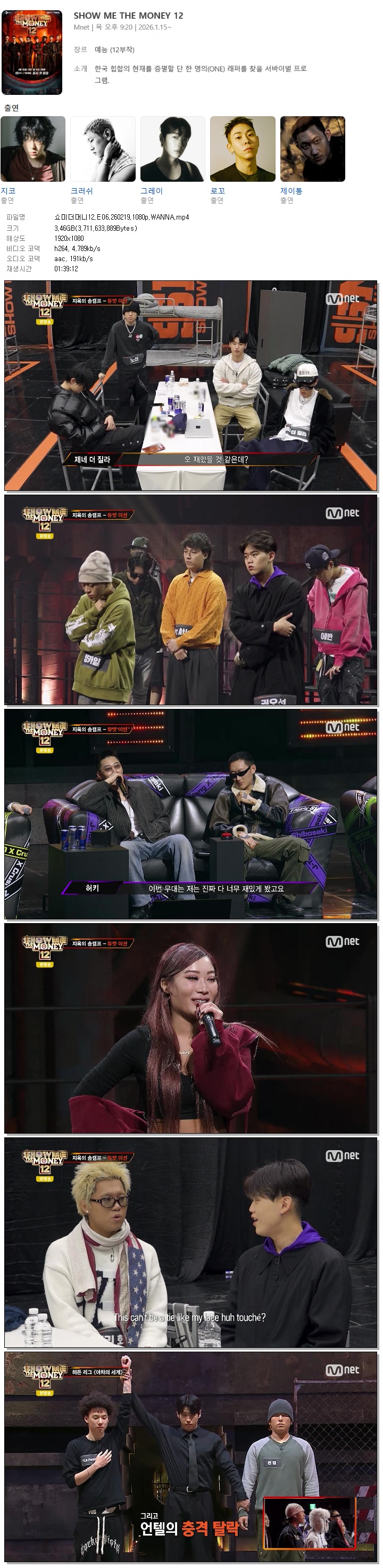 | [M.net] 쇼미더머니12.E06.260219.1080p.WANNA[크러쉬, 지코].mp4 | 3.5 G | 01:39:12 | 1920x1080 |