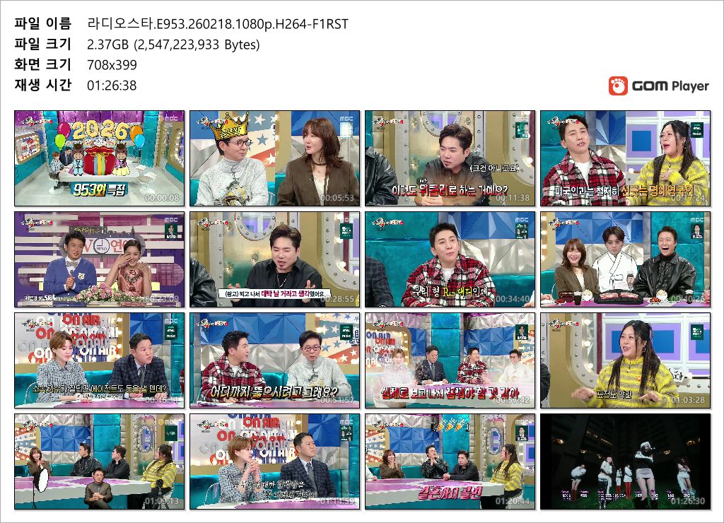 | 라디오스타.E953.260218.1080p.H264-F1RST.mp4 | 2.4 G | 01:26:38 | 1920x1080 |