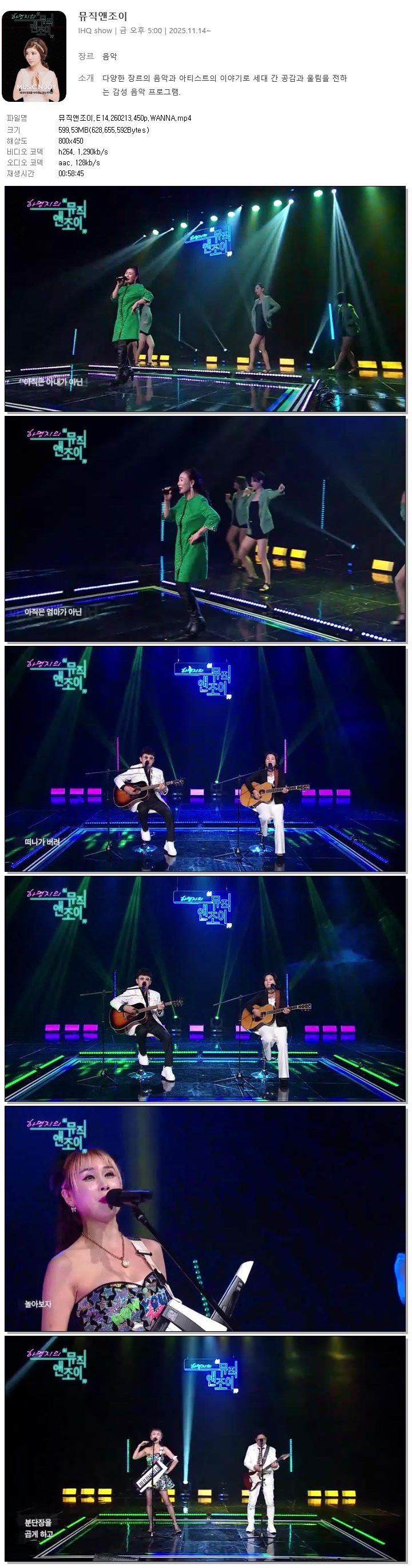 | [i SHOW] 뮤직앤조이.E14.260213.450p.WANNA[하명지].mp4 | 599.5 M | 00:58:45 | 800x450 |