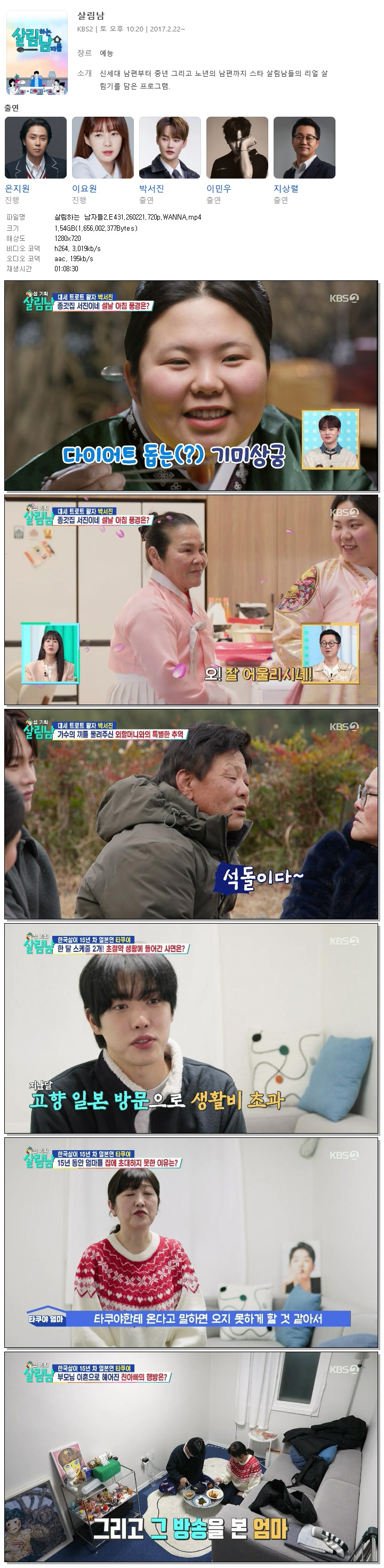 | [KBS2] 살림하는 남자들2.E431.260221.720p.WANNA[박서진, 타쿠야].mp4 | 1.5 G | 01:08:30 | 1280x720 |