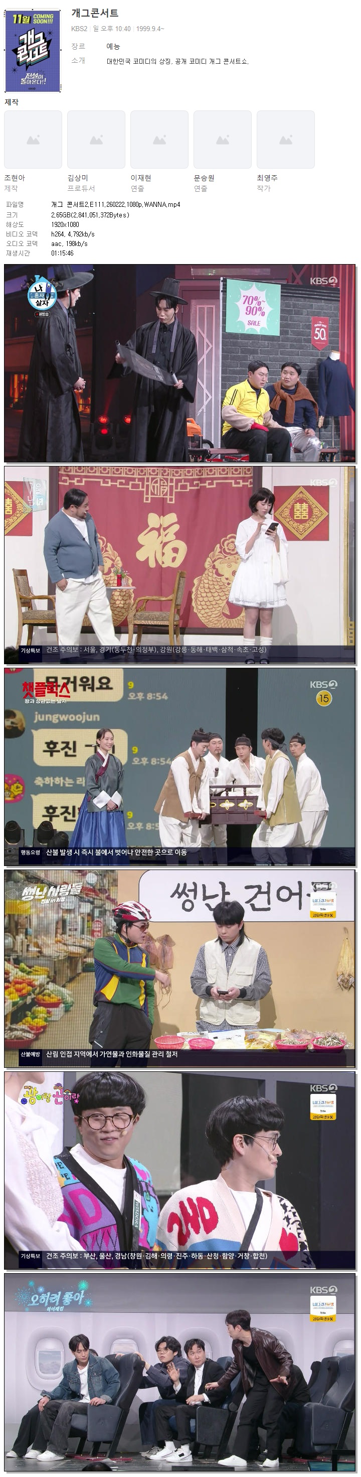 | [KBS2] 개그 콘서트2.E111.260222.1080p.WANNA[신윤승, 박성광].mp4 | 2.6 G | 01:15:46 | 1920x1080 |