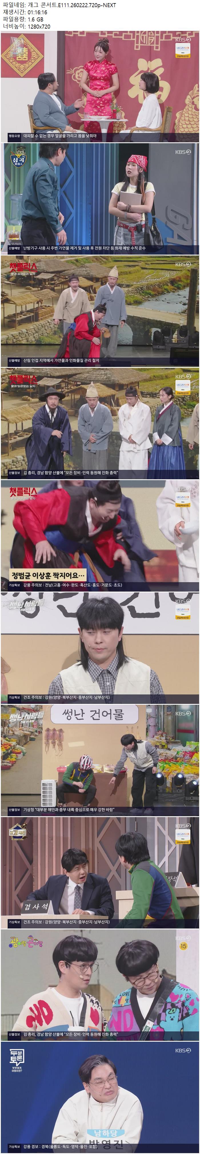 | 개그 콘서트.E111.260222.720p-NEXT.mp4 | 1.6 G | 01:16:00 | 1280x720 |