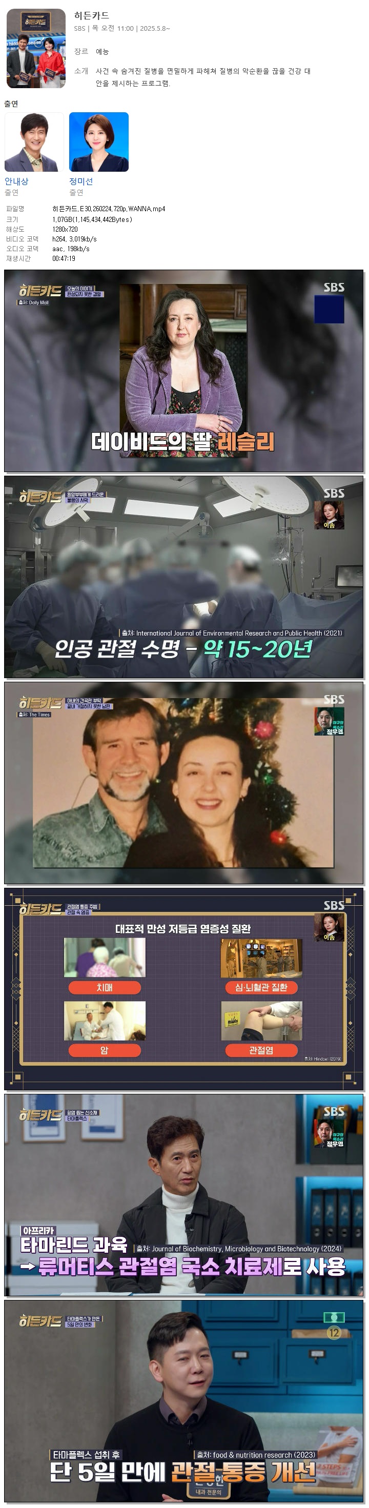 | [SBS] 히든카드.E30.260224.720p.WANNA[안내상, 정미선].mp4 | 1.1 G | 00:47:19 | 1280x720 |
