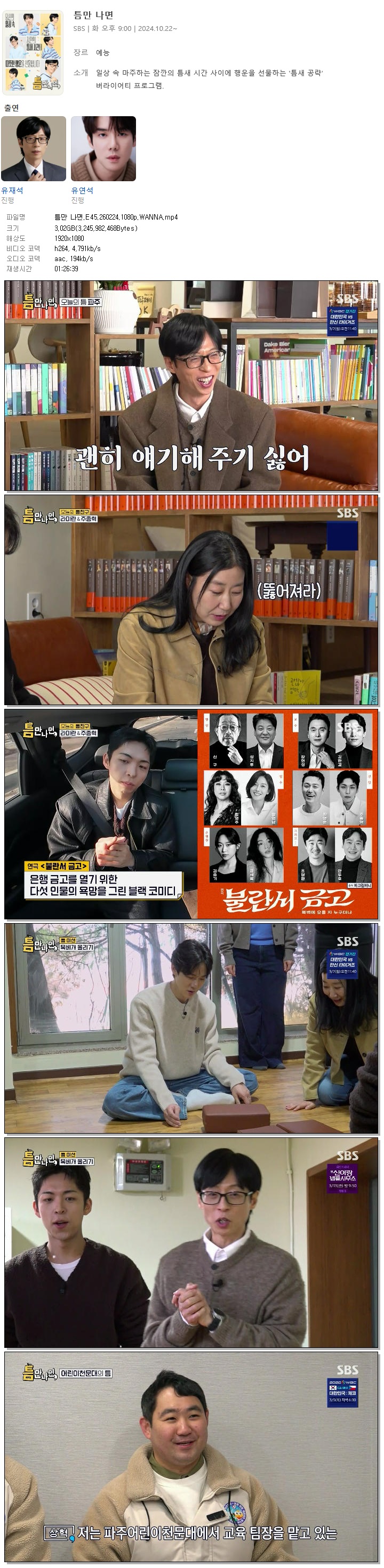 | [SBS] 틈만 나면.E45.260224.1080p.WANNA[라미란, 주종혁].mp4 | 3 G | 01:26:39 | 1920x1080 |