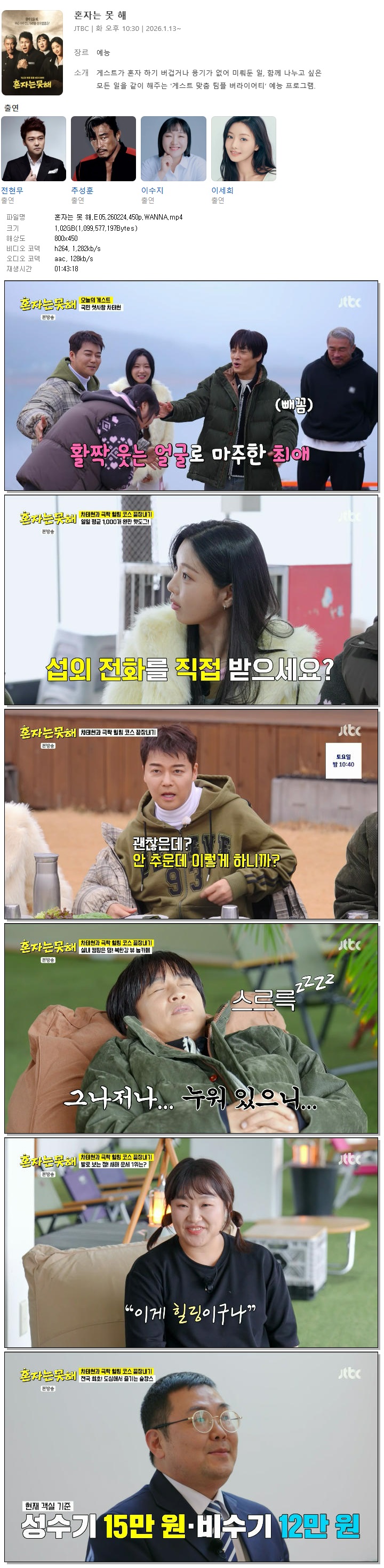 | [JTBC] 혼자는 못 해.E05.260224.450p.WANNA[차태현].mp4 | 1 G | 01:43:18 | 800x450 |