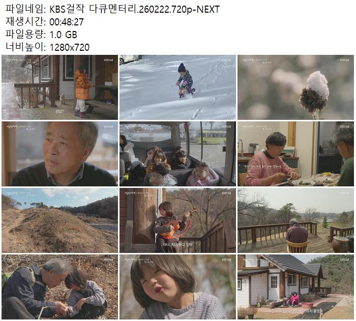 | KBS걸작 다큐멘터리.260222.720p-NEXT.mp4 | 1 G | 00:48:27 | 1280x720 |