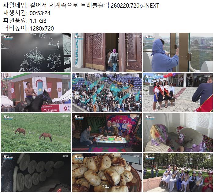 | 걸어서 세계속으로 트래블홀릭.260220.720p-NEXT.mp4 | 1.1 G | 00:53:24 | 1280x720 |