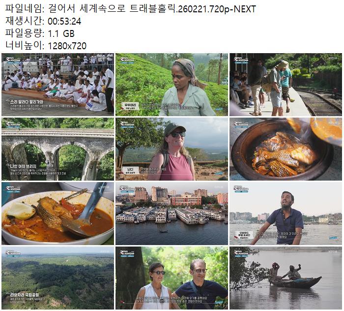 | 걸어서 세계속으로 트래블홀릭.260221.720p-NEXT.mp4 | 1.1 G | 00:53:24 | 1280x720 |