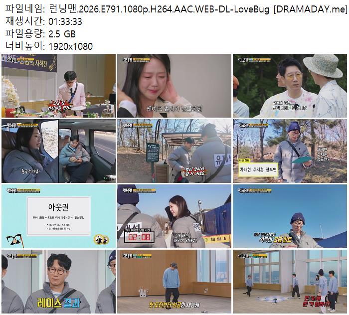 | 런닝맨.2026.E791.1080p.H264.AAC.WEB-DL-LoveBug [DRAMADAY.me].mkv | 2.5 G | 01:33:00 | 1920x1080 |