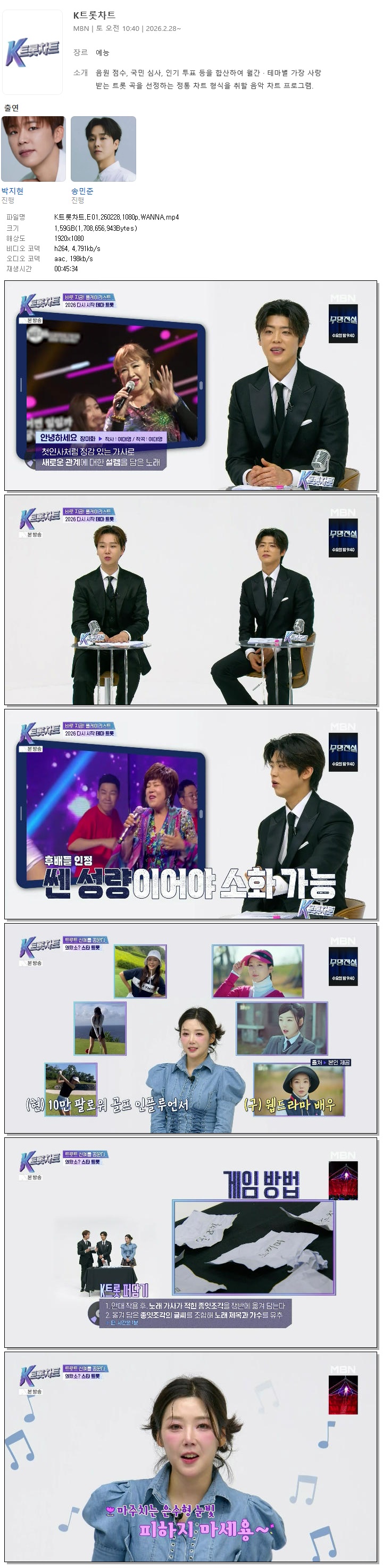 | [MBN] K트롯차트.E01.260228.1080p.WANNA[박지현, 송민준].mp4 | 1.6 G | 00:45:34 | 1920x1080 |