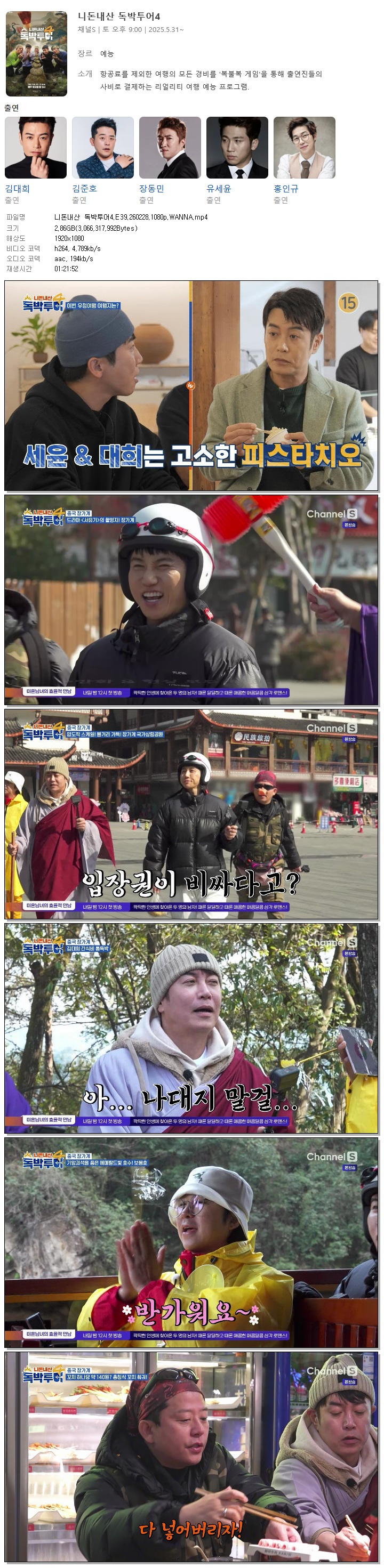 | [채널S] 니돈내산 독박투어4.E39.260228.1080p.WANNA[김준호, 장동민].mp4 | 2.9 G | 01:21:52 | 1920x1080 |