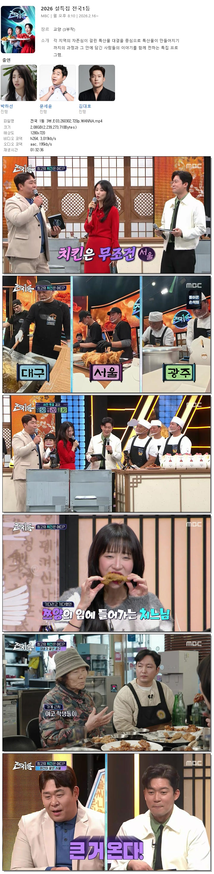 | [MBC] 전국 1등 3부.E03.260302.720p.WANNA[박하선, 문세윤].mp4 | 2.1 G | 01:32:36 | 1280x720 |