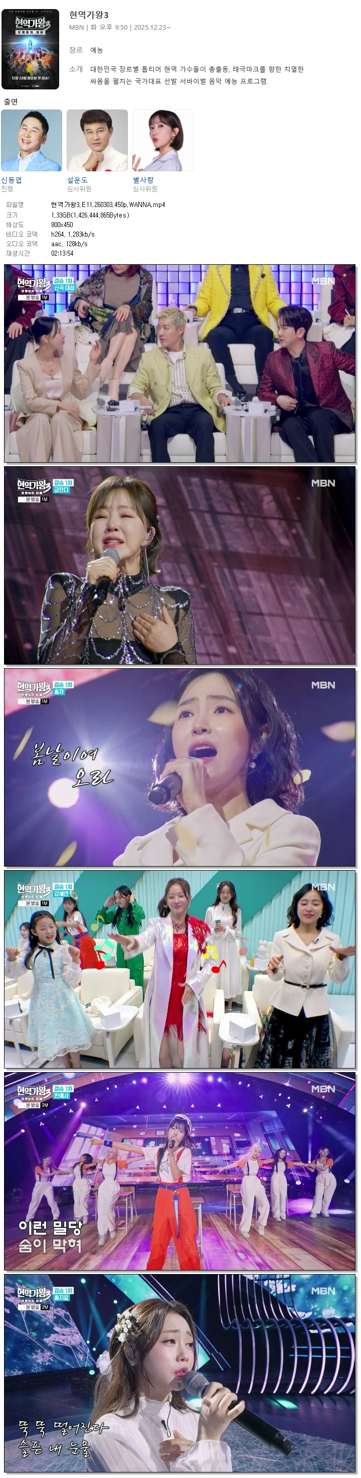 [MBN] 현역가왕3.E11.260303.450p.WANNA[홍지윤, 구수경].mp4 1.3 G 02:13:54 800x450