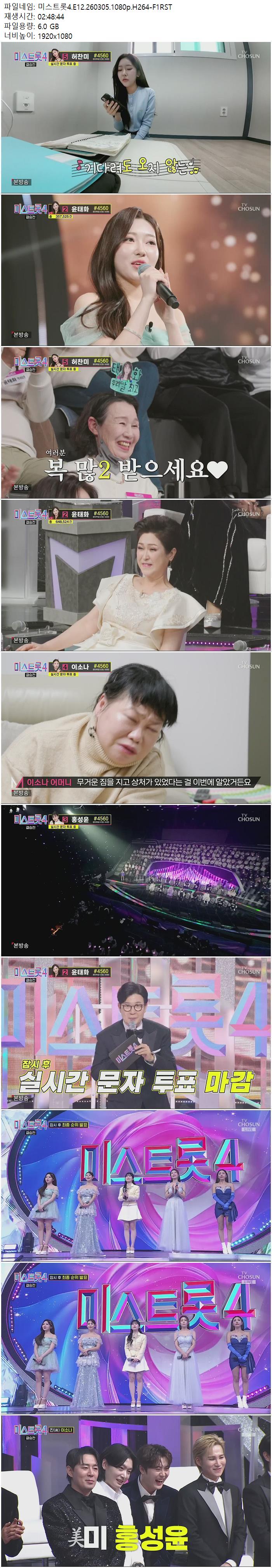 | 미스트롯4.E12.260305.1080p.H264-F1RST.mp4 | 6 G | 02:48:44 | 1920x1080 |