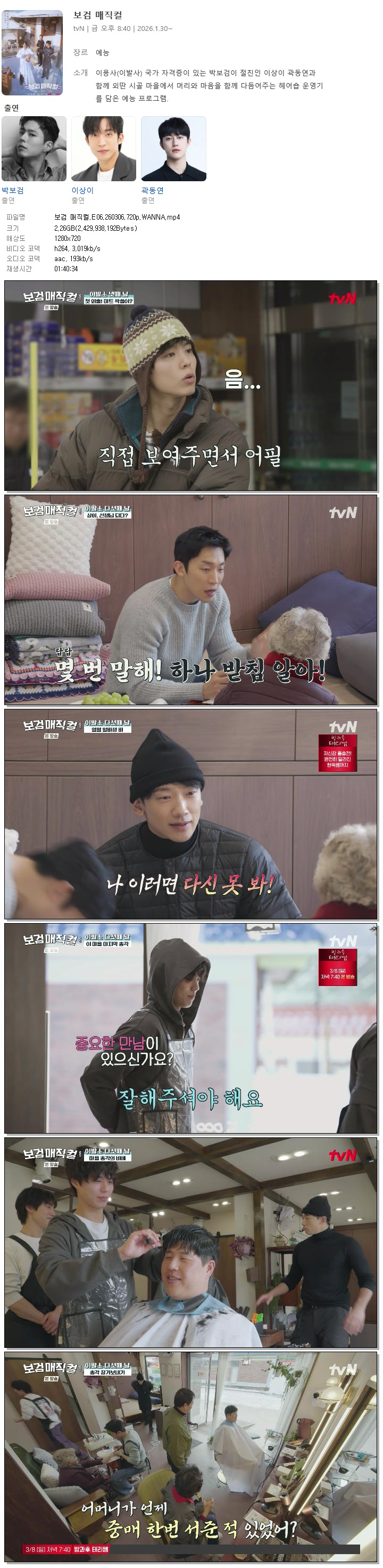 | [TVN] 보검 매직컬.E06.260306.720p.WANNA[박보검, 이상이].mp4 | 2.3 G | 01:40:34 | 1280x720 |