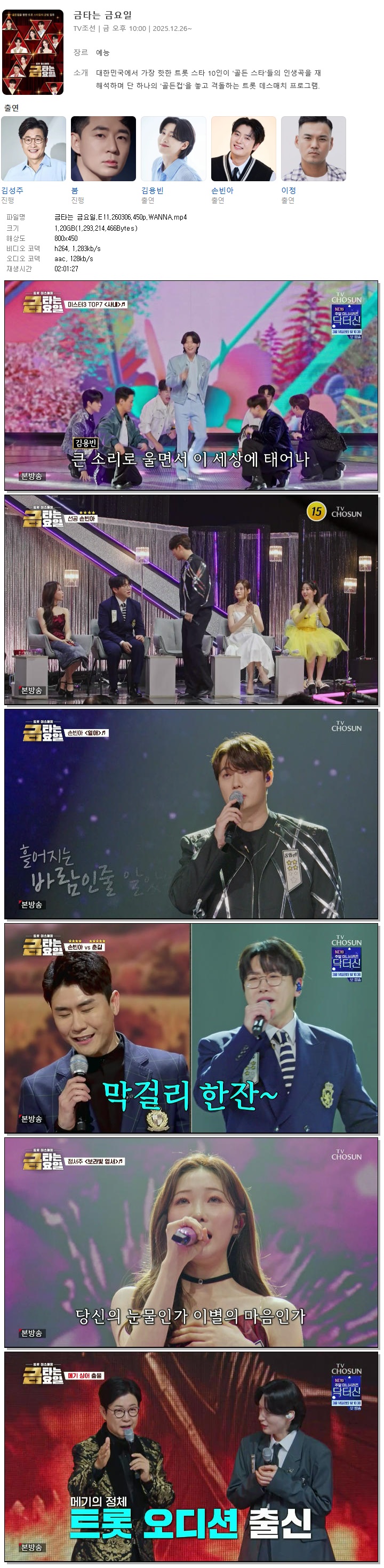 | [TV조선] 금타는 금요일.E11.260306.450p.WANNA[김용빈, 정서주].mp4 | 1.2 G | 02:01:27 | 800x450 |