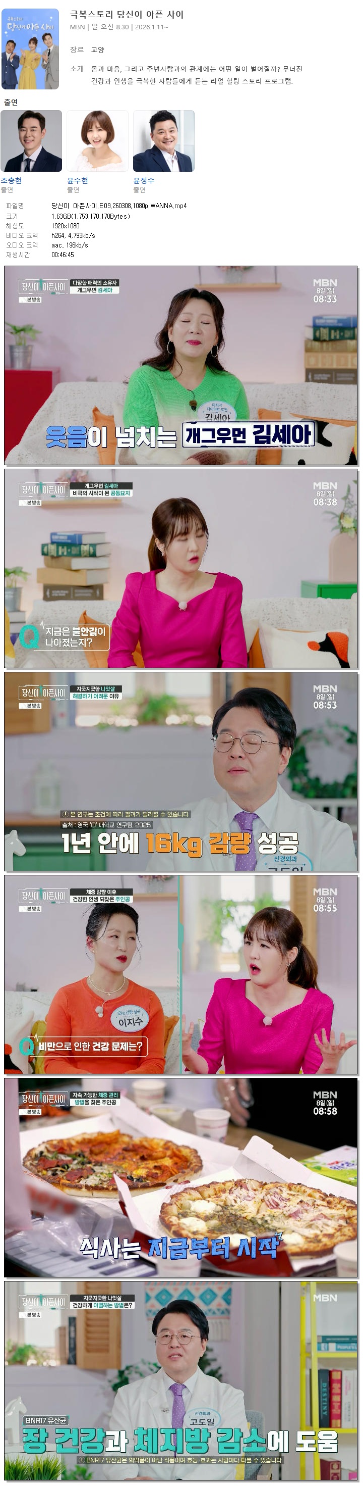 | [MBN] 당신이 아픈사이.E09.260308.1080p.WANNA[조충현, 윤수현].mp4 | 1.6 G | 00:46:45 | 1920x1080 |