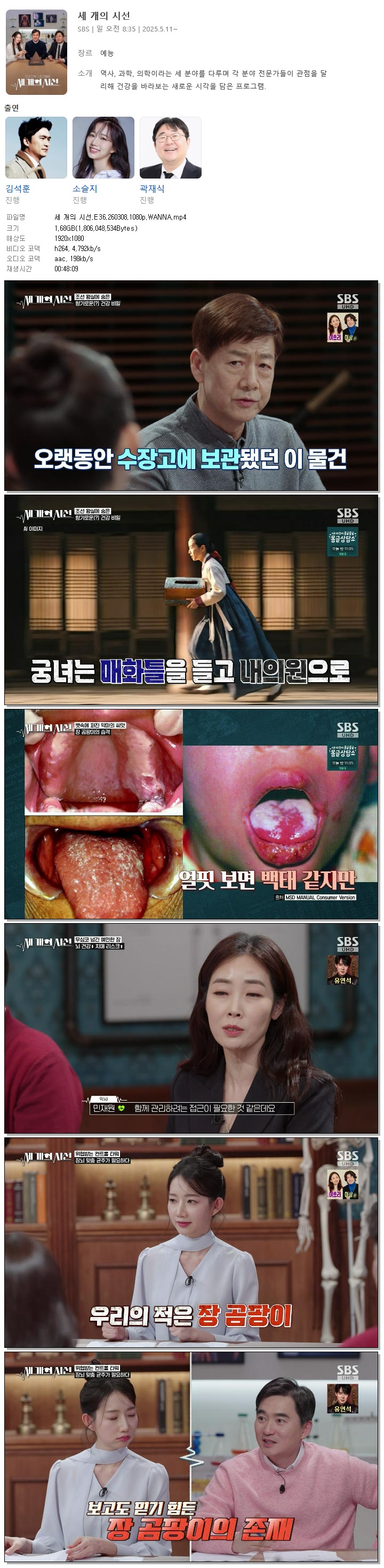| [SBS] 세 개의 시선.E36.260308.1080p.WANNA[김석훈, 소슬지].mp4 | 1.7 G | 00:48:09 | 1920x1080 |