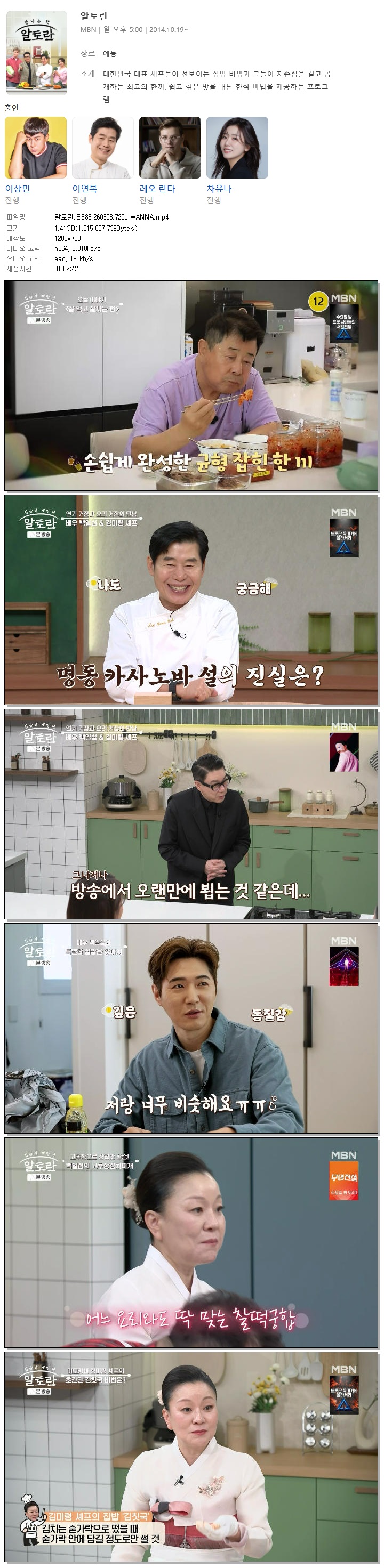 | [MBN] 알토란.E583.260308.720p.WANNA[이상민, 이연복].mp4 | 1.4 G | 01:02:42 | 1280x720 |