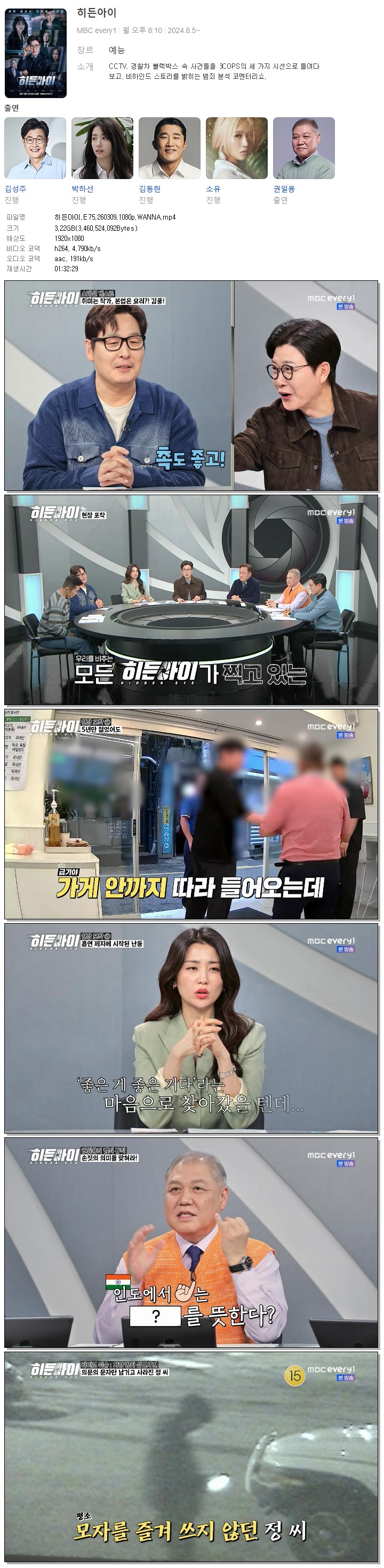 | [MBC Every1] 히든아이.E75.260309.1080p.WANNA[김성주, 박하선].mp4 | 3.2 G | 01:32:29 | 1920x1080 |