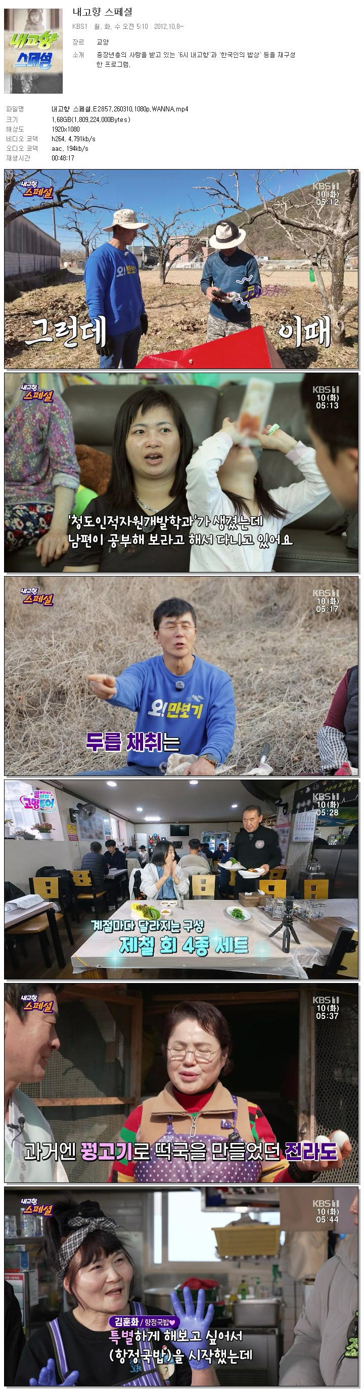| [KBS1] 내고향 스페셜.E2857.260310.1080p.WANNA.mp4 | 1.7 G | 00:48:17 | 1920x1080 |