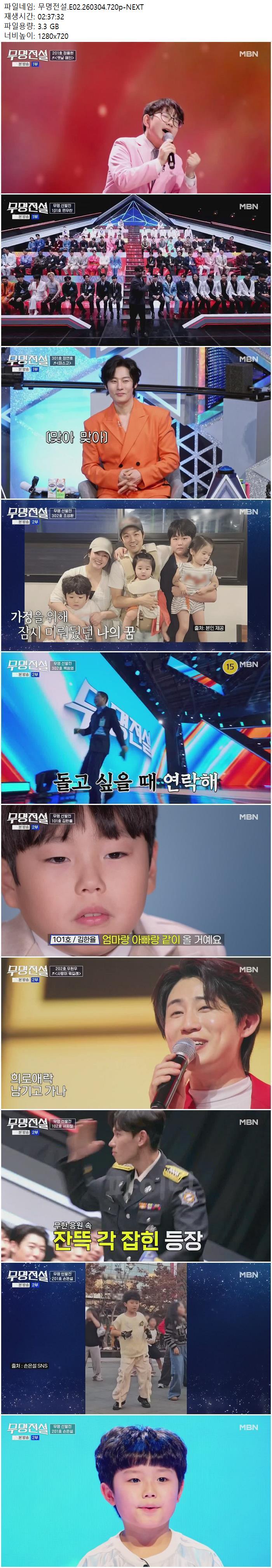| 무명전설.E02.260304.720p-NEXT.mp4 | 3.3 G | 02:37:32 | 1280x720 |