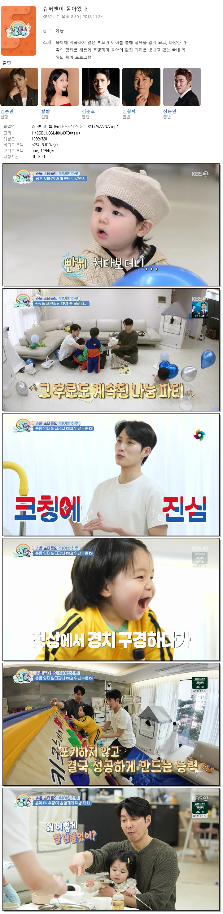 | [KBS2] 슈퍼맨이 돌아왔다.E620.260311.720p.WANNA[심형탁, 랄랄].mp4 | 1.5 G | 01:06:21 | 1280x720 |