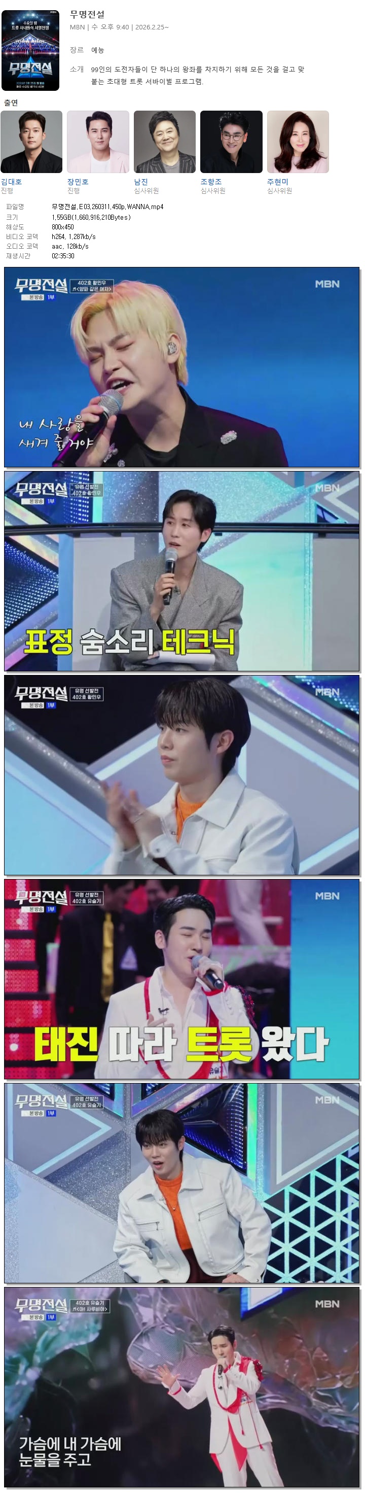 | [MBN] 무명전설.E03.260311.450p.WANNA[김대호, 장민호].mp4 | 1.5 G | 02:35:30 | 800x450 |