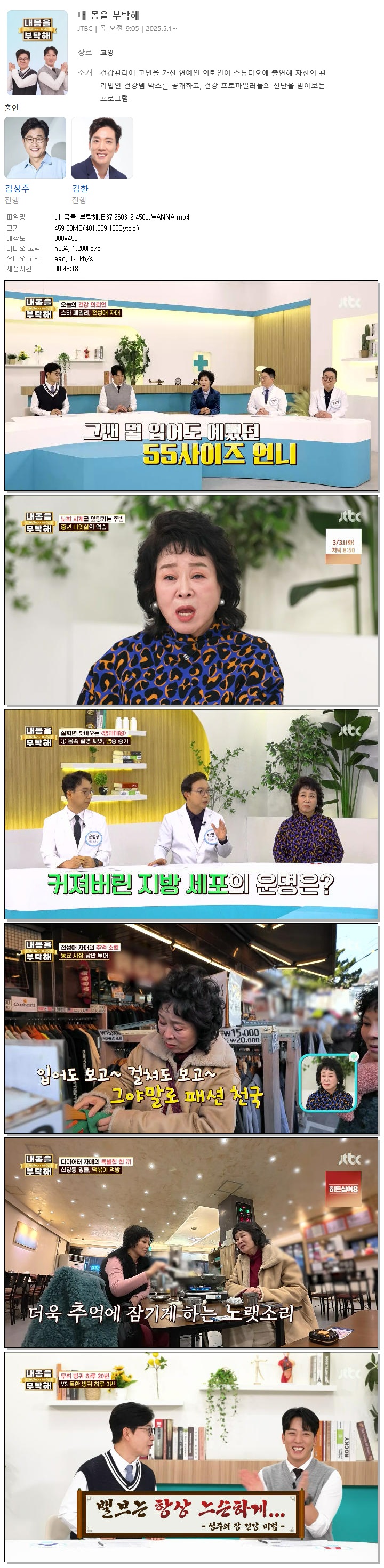 | [JTBC] 내 몸을 부탁해.E37.260312.450p.WANNA[김성주, 김환].mp4 | 459.2 M | 00:45:18 | 800x450 |