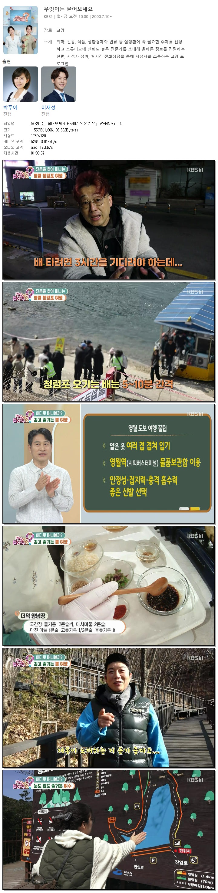 [KBS1] 무엇이든 물어보세요.E5907.260312.720p.WANNA[박주아, 이재성].mp4 1.6 G 01:08:57 1280x720