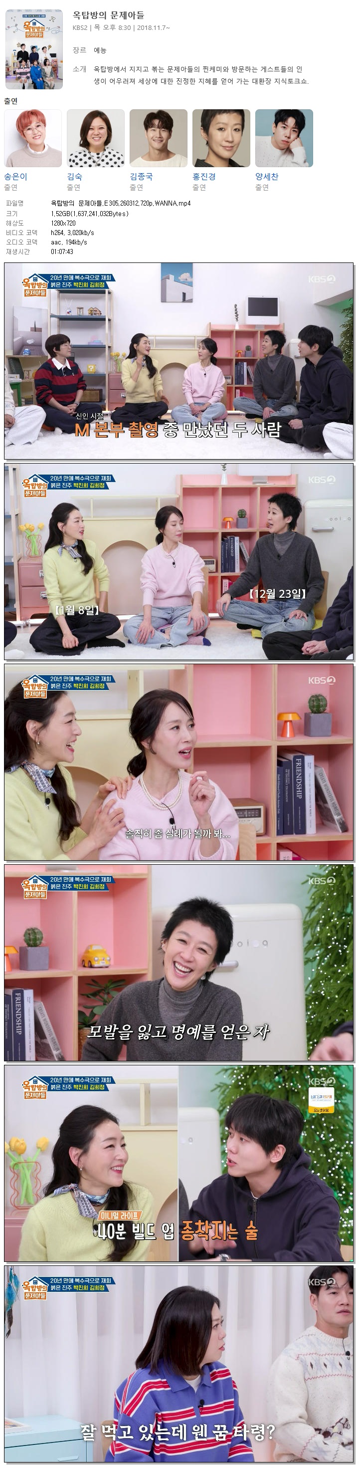 | [KBS2] 옥탑방의 문제아들.E305.260312.720p.WANNA[박진희, 김희정].mp4 | 1.5 G | 01:07:43 | 1280x720 |