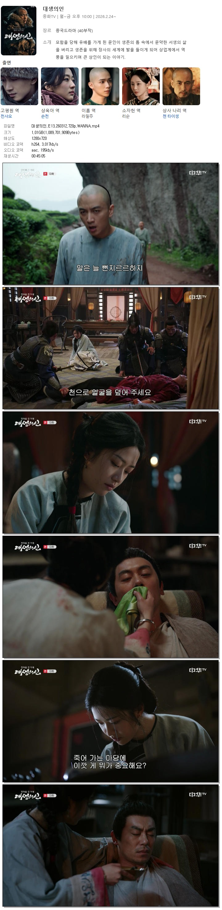 | [중화TV] 대생의인.E13.260312.720p.WANNA[천샤오, 손천].mp4 | 1 G | 00:45:05 | 1280x720 |