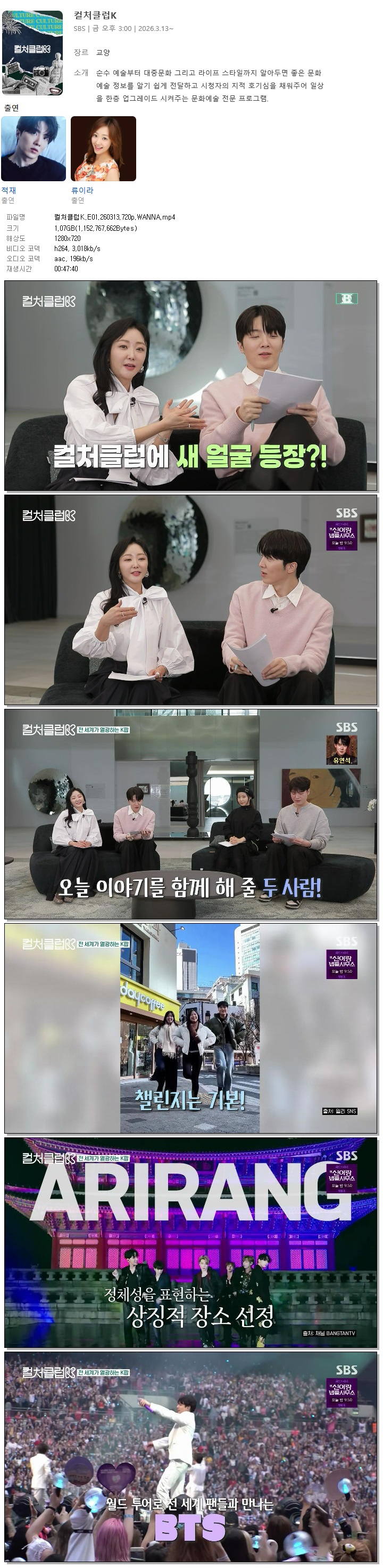 [SBS] 컬처클럽K.E01.260313.720p.WANNA[적재, 류이라].mp4 1.1 G 00:47:40 1280x720