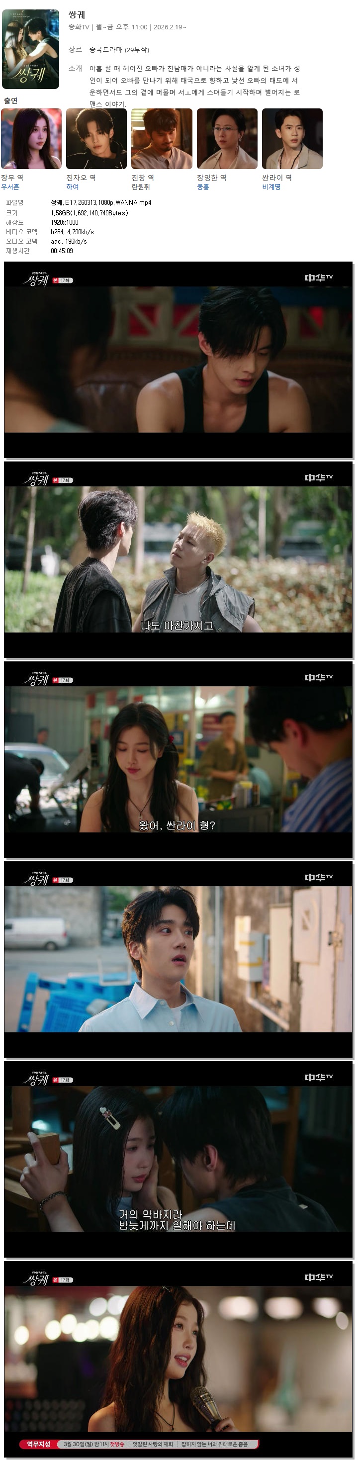 | [중화TV] 쌍궤.E17.260313.1080p.WANNA[우서흔, 하여].mp4 | 1.6 G | 00:45:09 | 1920x1080 |