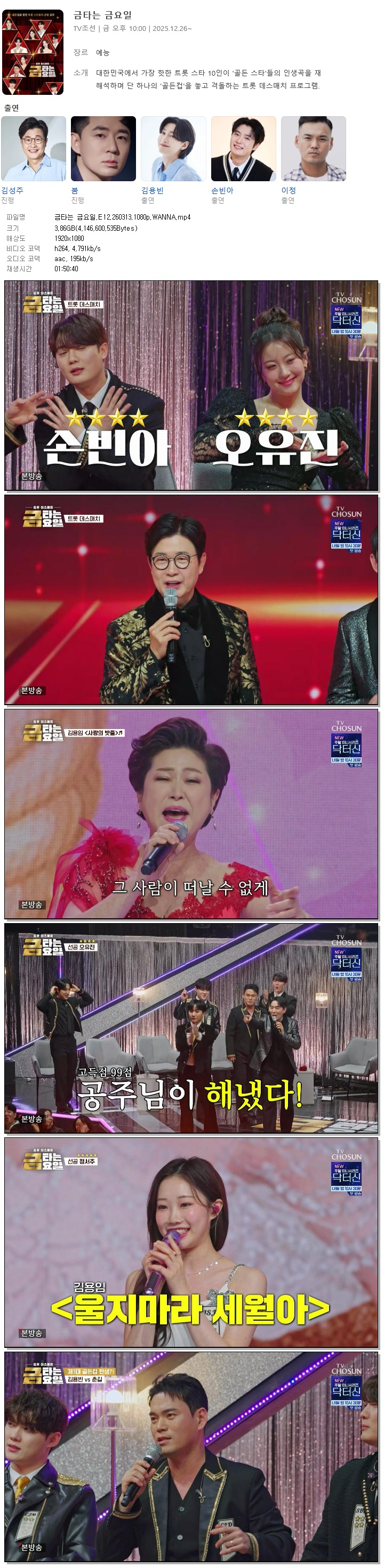 | [TV조선] 금타는 금요일.E12.260313.1080p.WANNA[김용빈, 천록담].mp4 | 3.9 G | 01:50:40 | 1920x1080 |