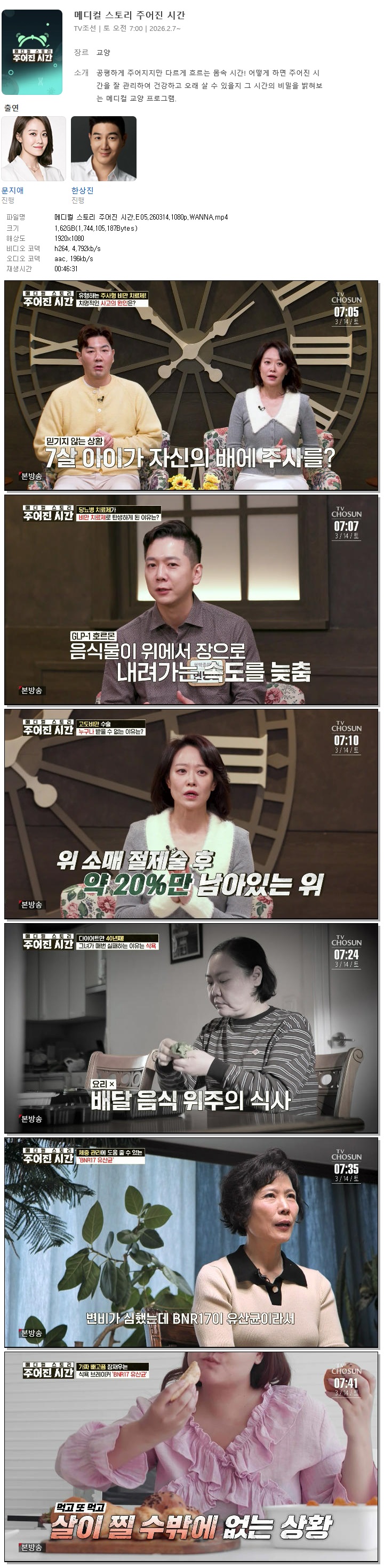 | [TV조선] 메디컬 스토리 주어진 시간.E05.260314.1080p.WANNA[문지애, 한상진].mp4 | 1.6 G | 00:46:31 | 1920x1080 |