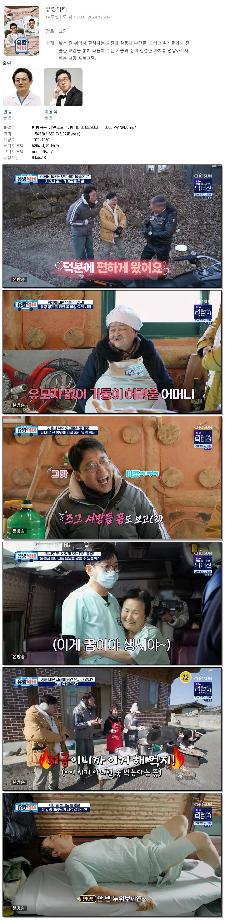 | [TV조선] 방방곡곡 낭만로드 유랑닥터.E52.260314.1080p.WANNA[안강, 이윤석].mp4 | 1.5 G | 00:44:18 | 1920x1080 |