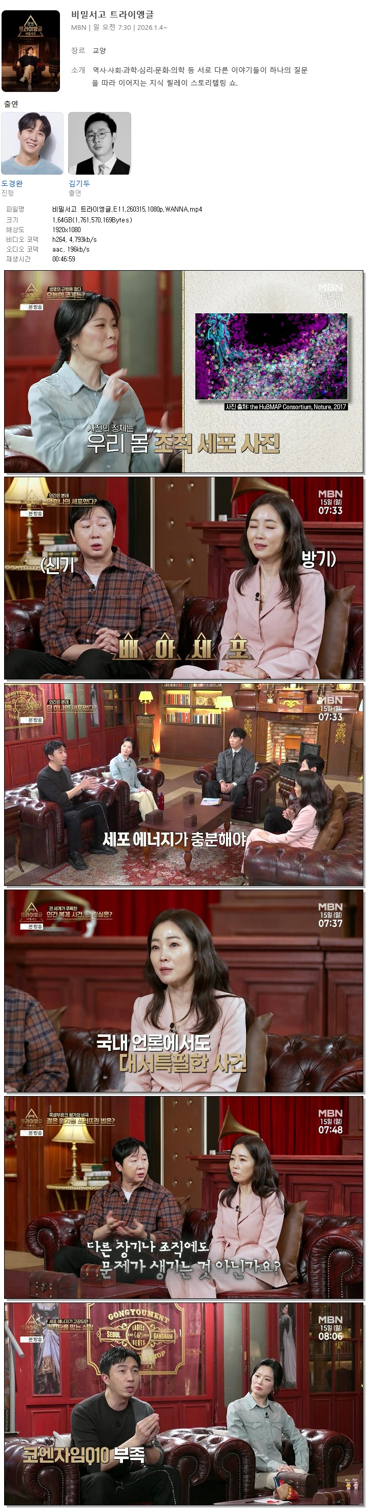 | [MBN] 비밀서고 트라이앵글.E11.260315.1080p.WANNA[도경완, 김기두].mp4 | 1.6 G | 00:46:59 | 1920x1080 |