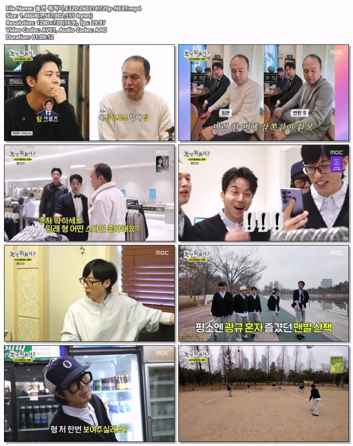 | 놀면 뭐하니.E320.260314.720p-NEXT.mp4 | 1.5 G | 01:09:00 | 1280x720 |