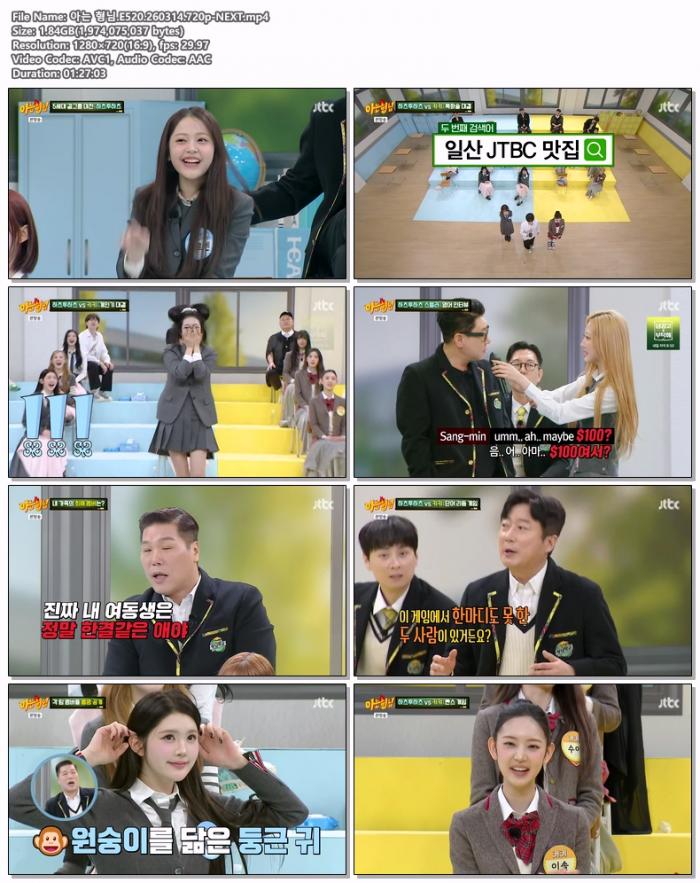 | 아는 형님.E520.260314.720p-NEXT.mp4 | 1.8 G | 01:27:00 | 1280x720 |