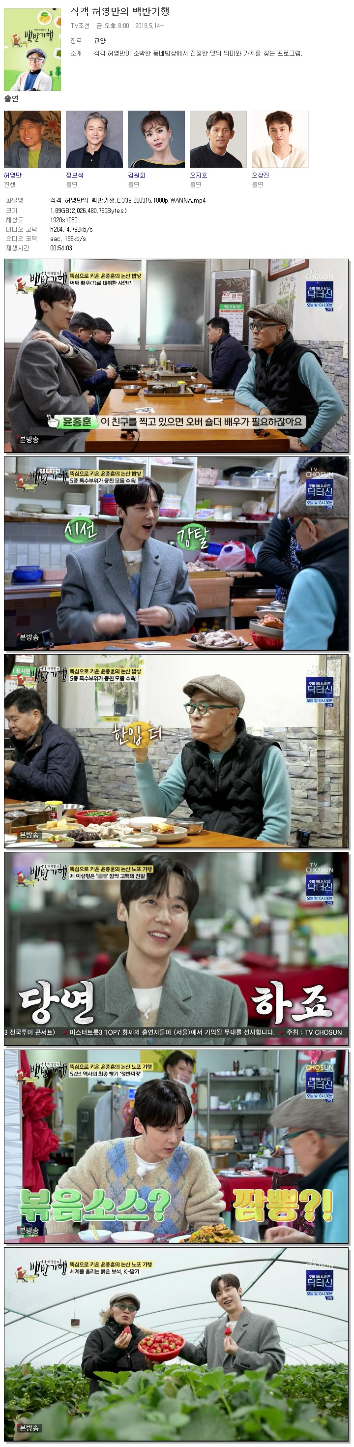 | [TV조선] 식객 허영만의 백반기행.E339.260315.1080p.WANNA[윤종훈].mp4 | 1.9 G | 00:54:03 | 1920x1080 |
