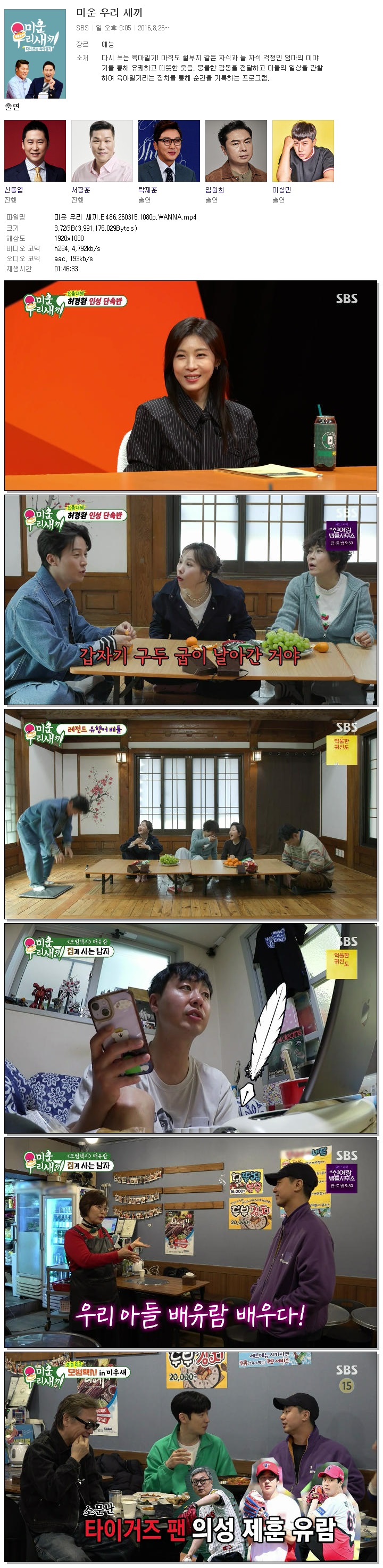 [SBS] 미운 우리 새끼.E486.260315.1080p.WANNA[배유람, 하지원].mp4 3.7 G 01:46:33 1920x1080